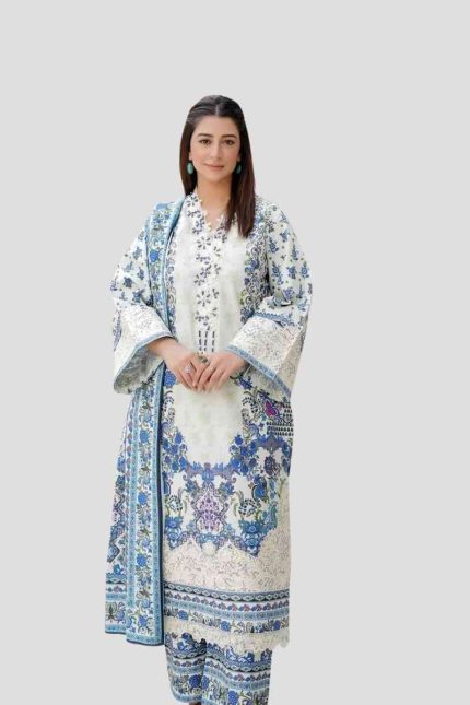 Elegant 3-piece unstitched lawn suit featuring digital prints and delicate embroidery. Perfect choice for summer wear with premium fabric and classy finish.